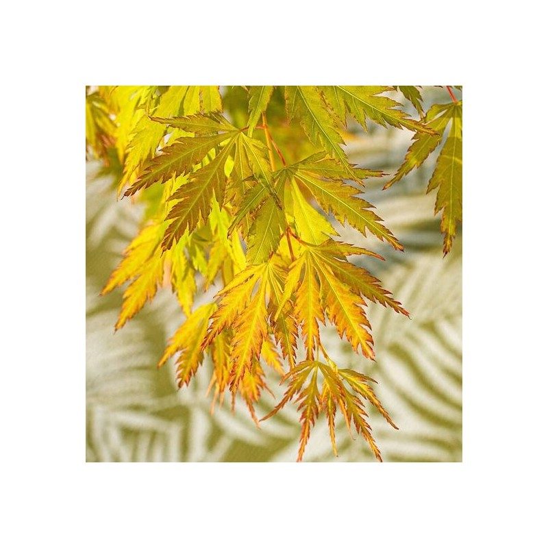 Frunzele sunt palmate, cu 5-7 lobi subțiri, de un galben-portocaliu strălucitor primăvara, uneori cu margini roz-roșiatice. Vara, frunzele devin un verde-gălbui, păstrând o nuanță caldă, iar toamna se transformă în portocaliu intens și roșu auriu, oferind un spectacol vizual vibrant. Crește ca un arbust compact, atingând 2-3 metri înălțime și 2-3 metri lățime, cu o coroană rotunjită, ușor arcuită. Creșterea lentă îl face ideal pentru grădini mici sau medii.Preferă semi-umbra sau soare filtrat, ideal sub copaci cu coroană rară sau lângă un zid orientat spre est. Soarele plin poate arde frunzele delicate, mai ales primăvara, iar umbra densă reduce intensitatea culorilor.